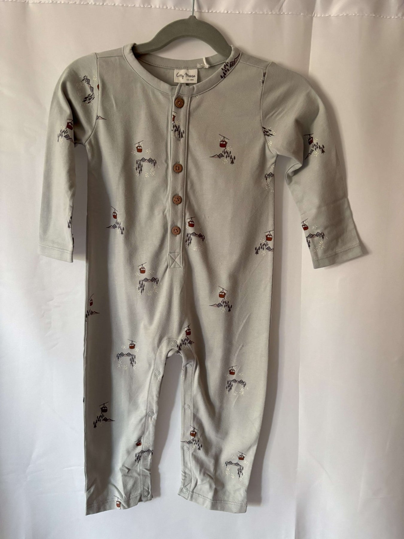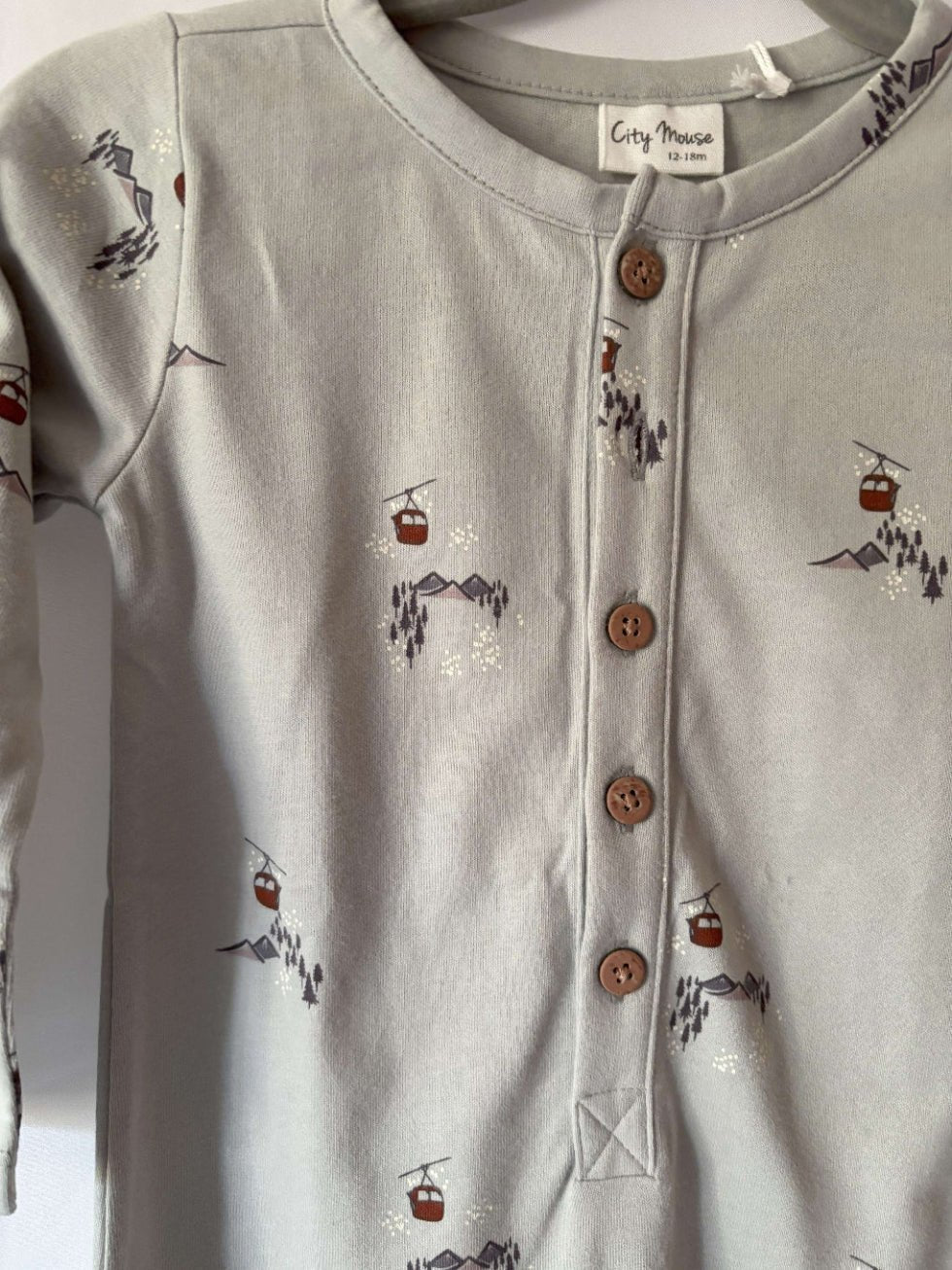 The Glacier Gondolas Henley Long Leg Romper combines cozy comfort with playful style, perfect for your little one's fall wardrobe. Crafted from soft, combed gray jersey fabric, this romper features a charming gondolas print that adds a fun touch. The henley design with snaps ensures easy dressing, while the long legs offer warmth for cooler days.