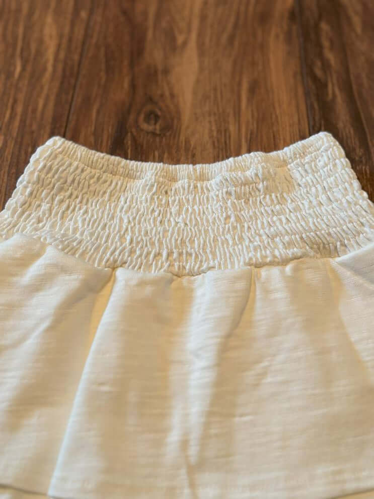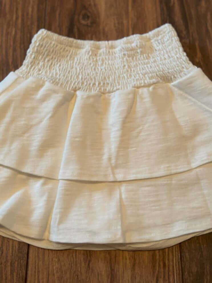 Get ready to twirl in style with the Nora Ivory Skort—the perfect blend of a skirt’s charm and the comfort of built-in shorts! Whether she's heading to school, a birthday party, or just playing in the backyard, this fun and versatile skort goes with everything and keeps up with every move.