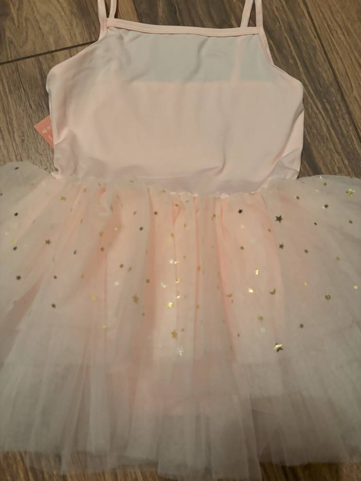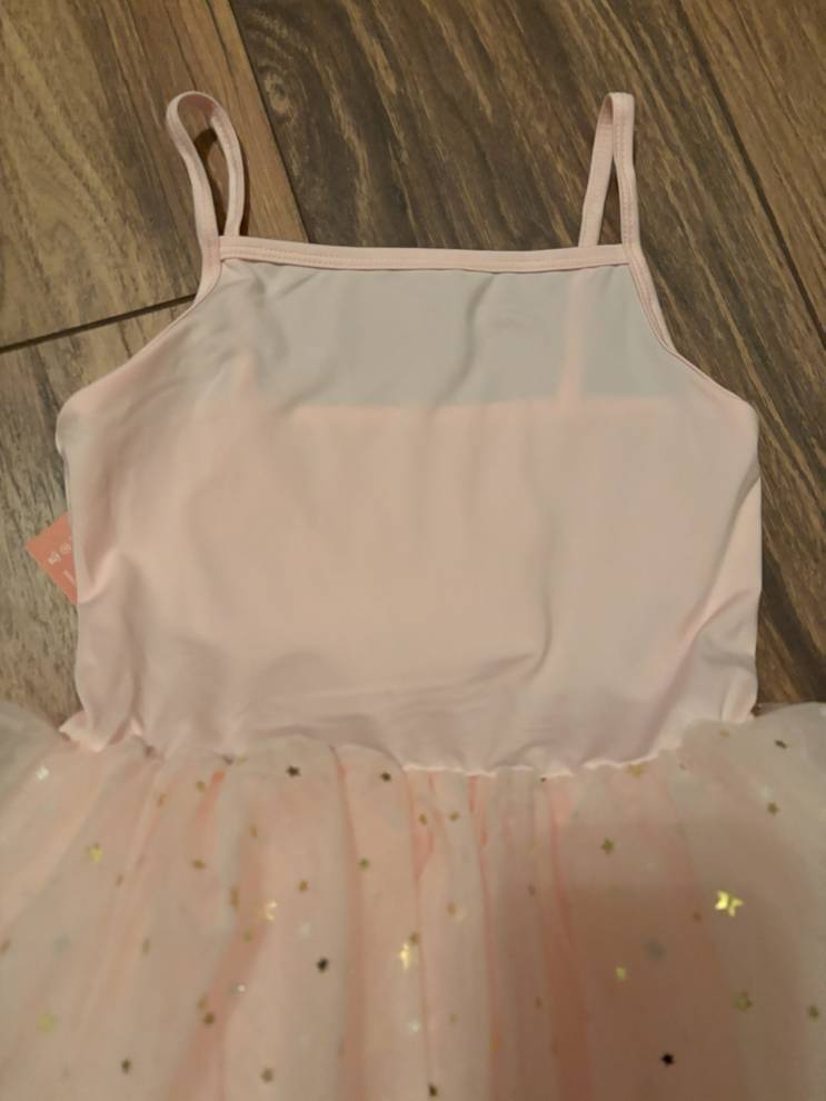 Design: Sleeveless bodice with layered tulle skirt and gold star accents