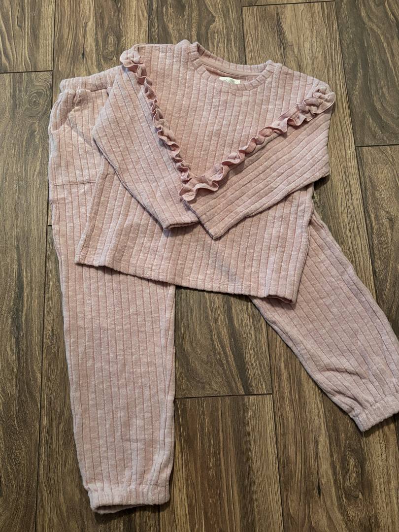 Young girl wearing a pink ribbed outfit with ruffled sleeves in a bright room.