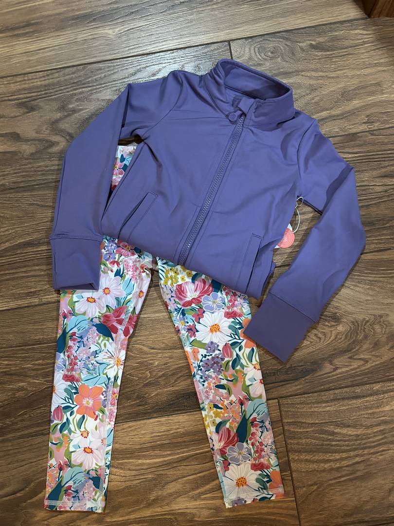 Purple jacket and floral leggings on a wooden floor