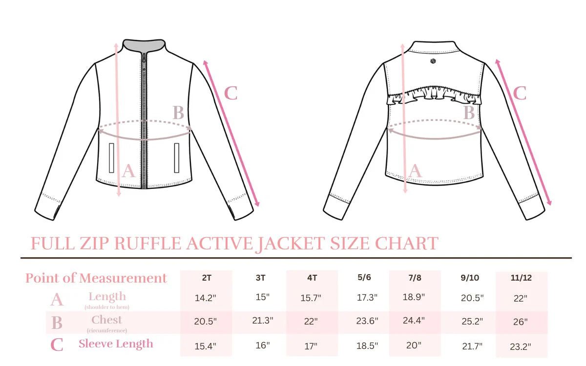 Size chart for a full zip ruffle active jacket with measurements in inches.