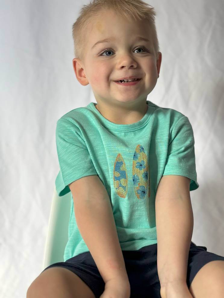 Ride the waves of style with this Aqua Surfboard Printed Tee, the perfect addition to your little one’s summer wardrobe. Featuring a bold, colorful surfboard print, this tee embodies the adventurous spirit of the beach and the laid-back vibes of the summer season.