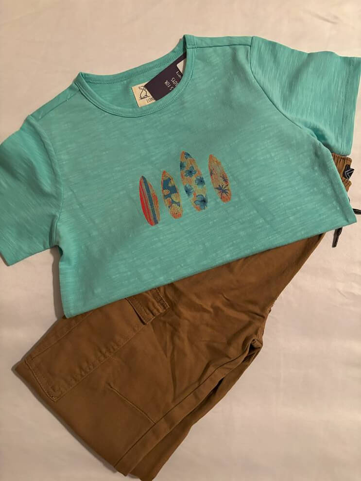 Vibrant Surfboard Design: A fun and eye-catching surfboard print that adds a burst of color to your child's outfit.